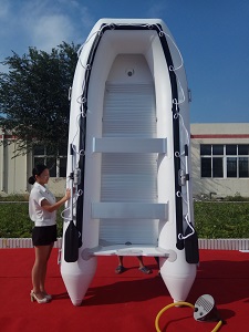 記得以前有個客戶被別的商家忽悠,一條幾百塊的充氣船價格也說可以站立,買回去后別說站立,坐在里面都搖晃的很厲害,相信很多人第一次買都遇過這種事,主要是這種充氣船價格便宜,誘惑力大。聽過很多用戶說怕船不穩(wěn)定,我們老總就開始重視這個問題,他自己帶了一條船開進(jìn)湖中,帶的是平底船,剛坐上去就搖晃的很厲害,試過很多次都無法站立。回去后找了很多資料來研究如何能使充氣船可以站立,經(jīng)過多次實驗驗證,把平底船做成V型底,在船底加固一根充氣龍骨,使充氣船底部成V型,這樣就可以將船上的重力集中到V型底重心部位,這樣即減小了水對船的阻力,也增加了整個船體的穩(wěn)定性,使船體不易搖晃側(cè)翻。內(nèi)部使用鋁合金板為船的地板,承受能力加強(qiáng)人不易踩空,人現(xiàn)在上面如履平地。